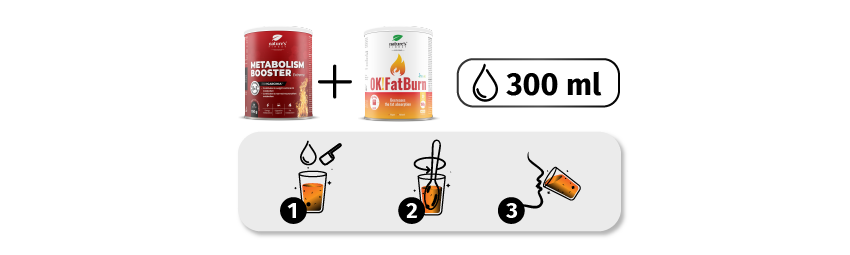 PRIMA DEL PRANZO: 5 g (1 misurino) Metabolism Booster Extreme e 5 g (1 misurino) Ok!Fatburn, mescolare in 300 ml di acqua e bere.