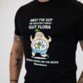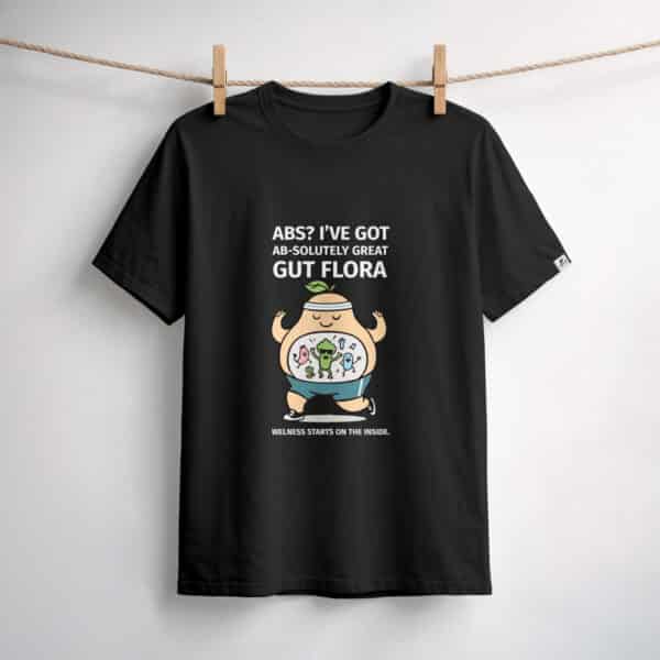 Una divertente e spiritosa T-shirt nera pensata per portare un tocco di umorismo nel tuo guardaroba quotidiano. Con la frase giocosa “ABS? I’ve got AB-solutely great GUT FLORA,” è un promemoria leggero che il benessere parte da dentro.
