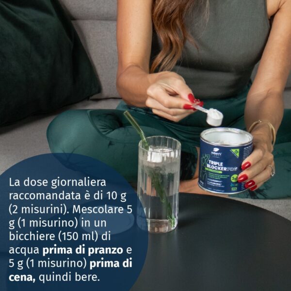 La dose giornaliera raccomandata è di 10 g (2 misurini). Mescolare 5 g (1 misurino) in un bicchiere (150 ml) di acqua prima di pranzo e 5 g (1 misurino) prima di cena, quindi bere.