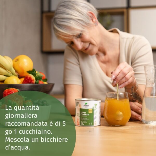 La dose giornaliera consigliata è di 5 g ovvero 1 cucchiaino. Mescolare in un bicchiere d’acqua.