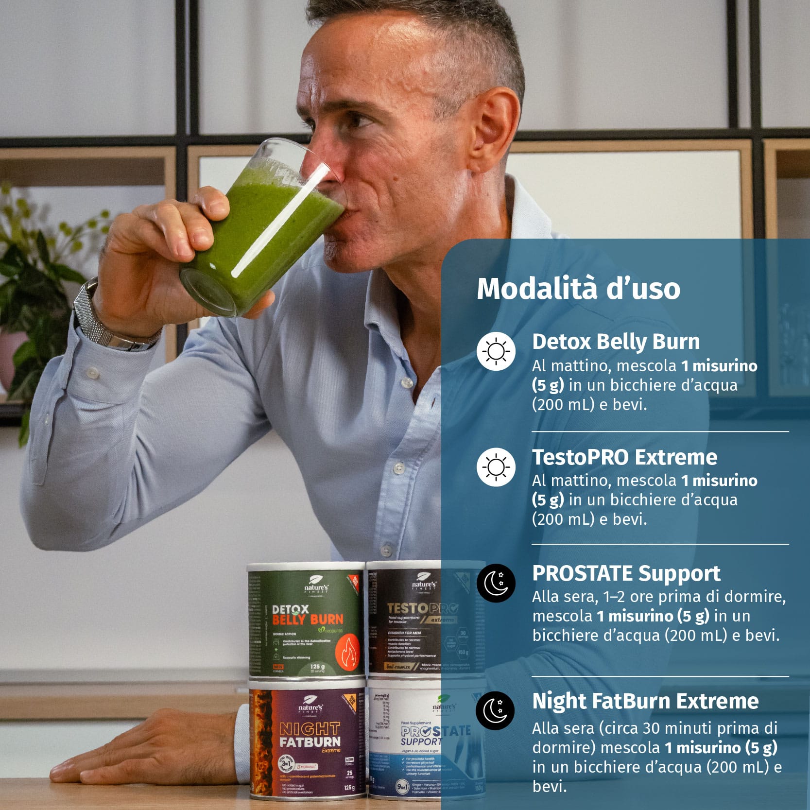 La sera, 1–2 ore prima di dormire, mescolare 1 misurino (5 g) in un bicchiere d’acqua (200 ml) e bere.
