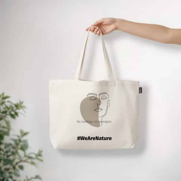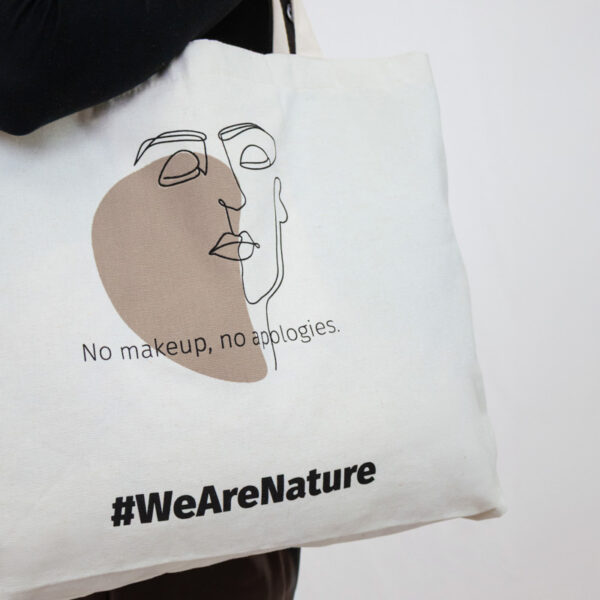 Una tote bag senza tempo che celebra l’autenticità e l’espressione di sé. Con un disegno minimalista a linee di un volto sereno, porta con fierezza il messaggio “No makeup, no apologies,” incoraggiandoci ad abbracciare il nostro io naturale.