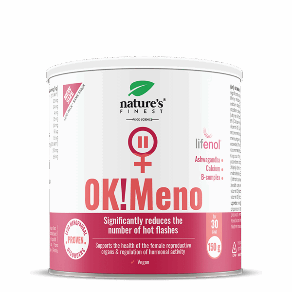 OK!Meno contiene l’estratto vegetale brevettato Lifenol®, che migliora la qualità della vita delle donne in menopausa in 6 settimane, riducendo significativamente la frequenza delle vampate di calore e della sudorazione notturna¹*. In combinazione con l’ashwagandha, che supporta l’equilibrio mentale e nervoso e riduce l’ansia², offre un sostegno completo.