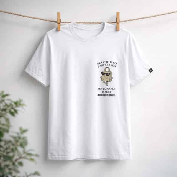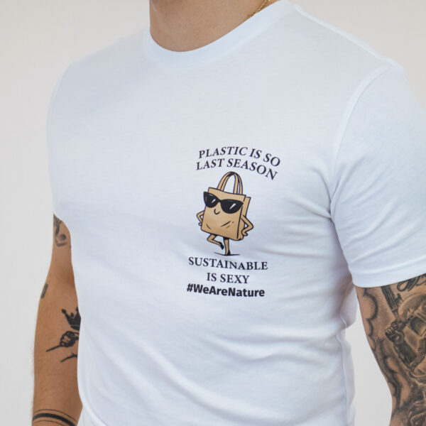 Una T-shirt bianca minimalista che unisce stile e intenzione. Con l’audace frase “La plastica è così della scorsa stagione. La sostenibilità è sexy.” in una grafica d’impatto, aggiunge un tocco sicuro e giocoso a qualsiasi outfit.