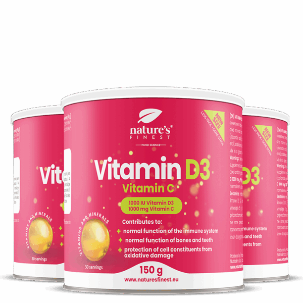 Con la vitamina D3 e la vitamina C in polvere, assicuriamo il miglior assorbimento, che inizia non appena viene a contatto con la nostra saliva. Il ruolo principale della vitamina D è quello di mantenere l’omeostasi e una concentrazione costante di calcio e fosfato nel plasma, e la vitamina C agisce come un potente antiossidante.