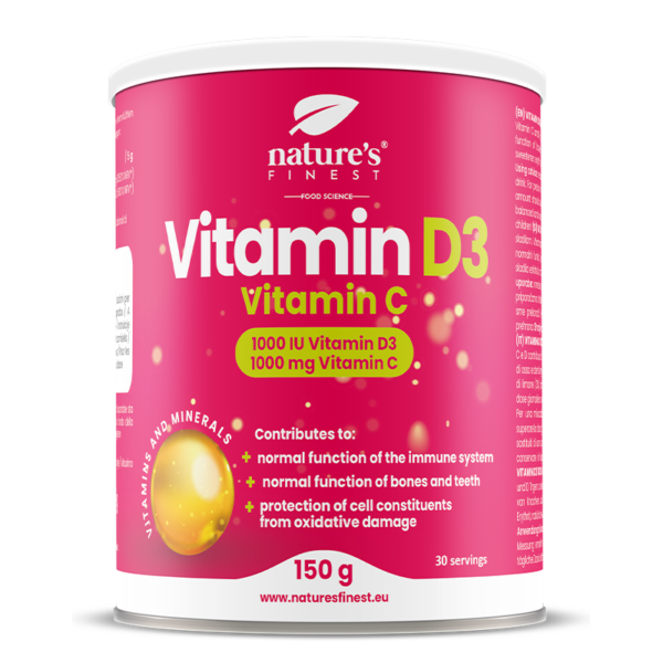 Con la vitamina D3 e la vitamina C in polvere, assicuriamo il miglior assorbimento, che inizia non appena viene a contatto con la nostra saliva. Il ruolo principale della vitamina D è quello di mantenere l’omeostasi e una concentrazione costante di calcio e fosfato nel plasma, e la vitamina C agisce come un potente antiossidante.